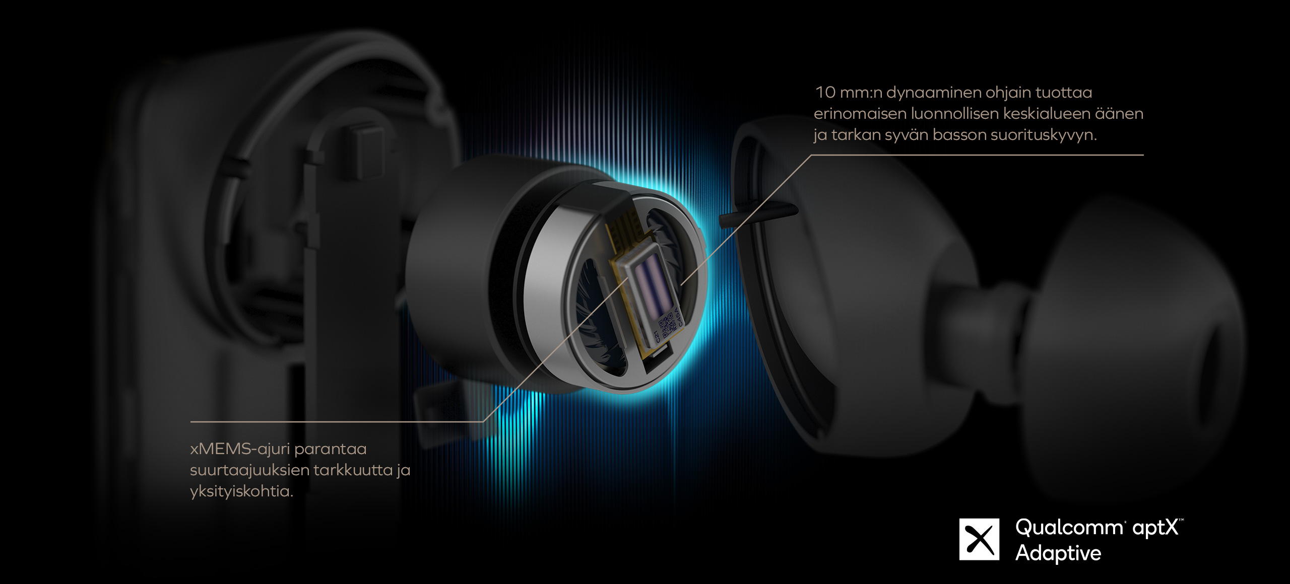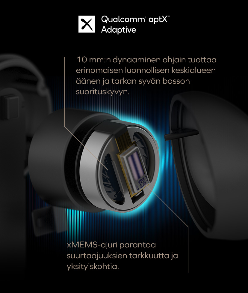 xMEMS-teknologian voimalla ja räätälöityjen 10 mm dynaamisten ohjainten avulla voit nauttia rikkaasta ja yksityiskohtaisesta ääniprofiilista kaikissa genreissä, matalista bassoista kirkkaisiin korkeuksiin. Yhdessä laadukkaiden aptX Adaptive -audiokoodekkien kanssa Creative Aurvana Ace tarjoaa erinomaisen äänen suorituskyvyn liikkeellä ollessa.