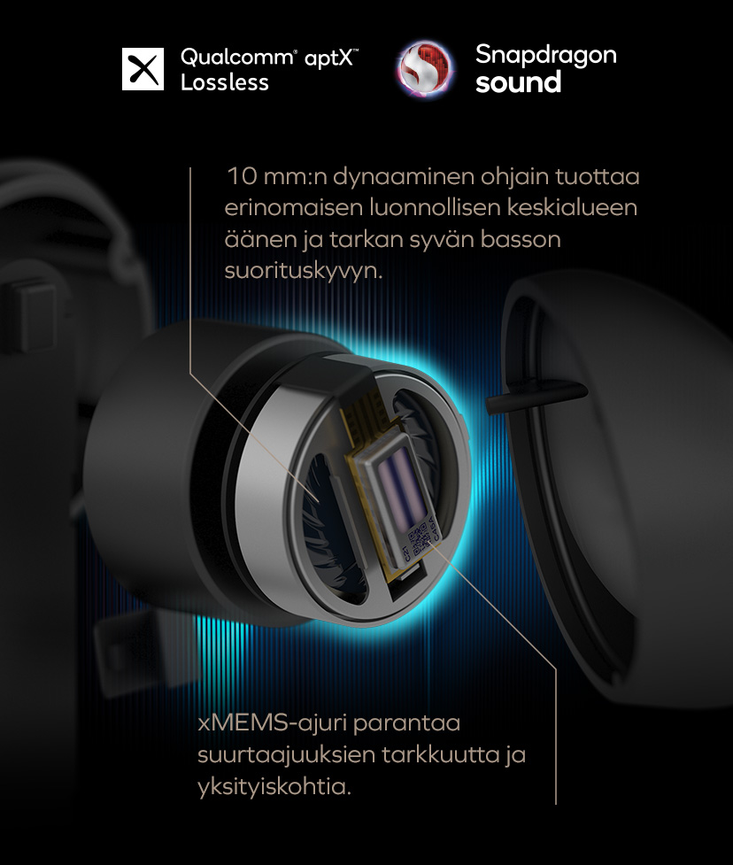 Koe ylivertainen CD-laadun selkeys ja tarkkuus, jota parantaa lisää Snapdragon Sound ja Qualcomm® aptX Lossless -teknologia, Qualcomm® Adaptive Active Noise Cancellation ja paljon muuta. Näitä ensiluokkaisia ominaisuuksia täydentää kauniisti esteettisesti miellyttävä läpikuultava kompakti latauskotelo.