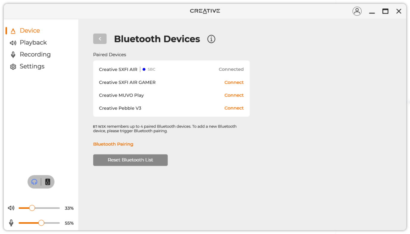 Unohditko laitteiden järjestyksen? Ei huolta. Voit ladata ja asentaa Creative-sovelluksen PC-tietokoneellesi ja tarkistaa muistissa olevat laitteet. Voit myös valita lähellä olevia laitteita paritettavaksi tai uusia koko yhdistettyjen laitteiden listan helposti ohjelmiston kautta.