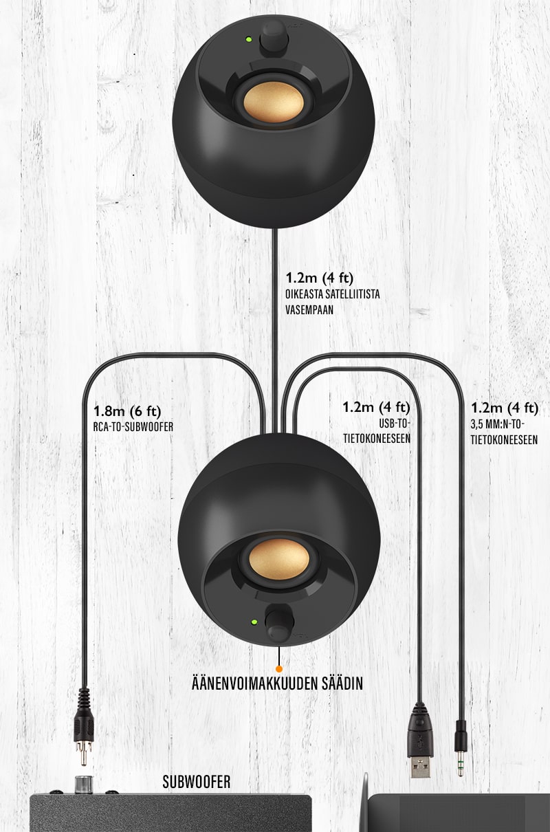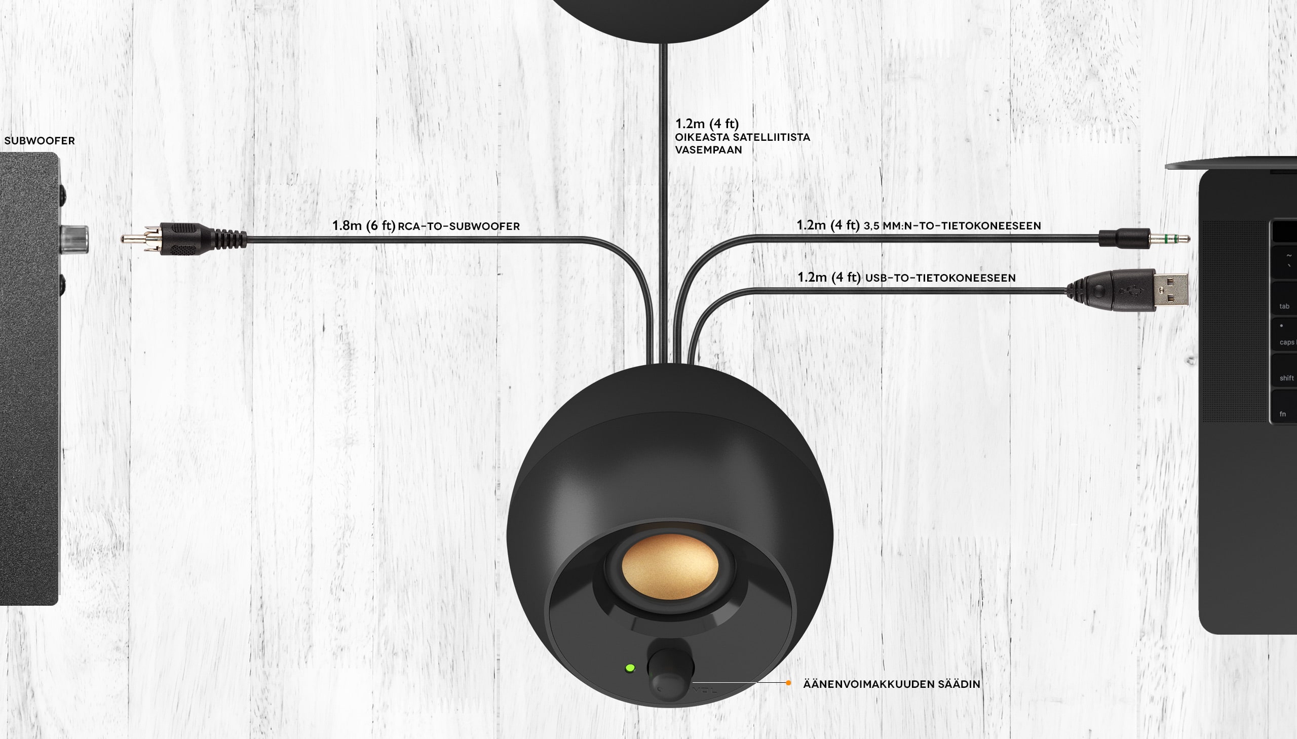 Kaiutinten virransyöttö on toteutettu kokonaan USB-yhteydellä, joten pistorasiaa ei tarvita. Liitä vain laitteesi Pebble Plus ‑kaiuttimiin 3,5 mm:n AUX-kaapelilla, niin kaikki on valmista! Käytön helpottamiseksi pääkaiuttimen etuosassa on eteenpäin suunnatut äänenvoimakkuussäätimet.