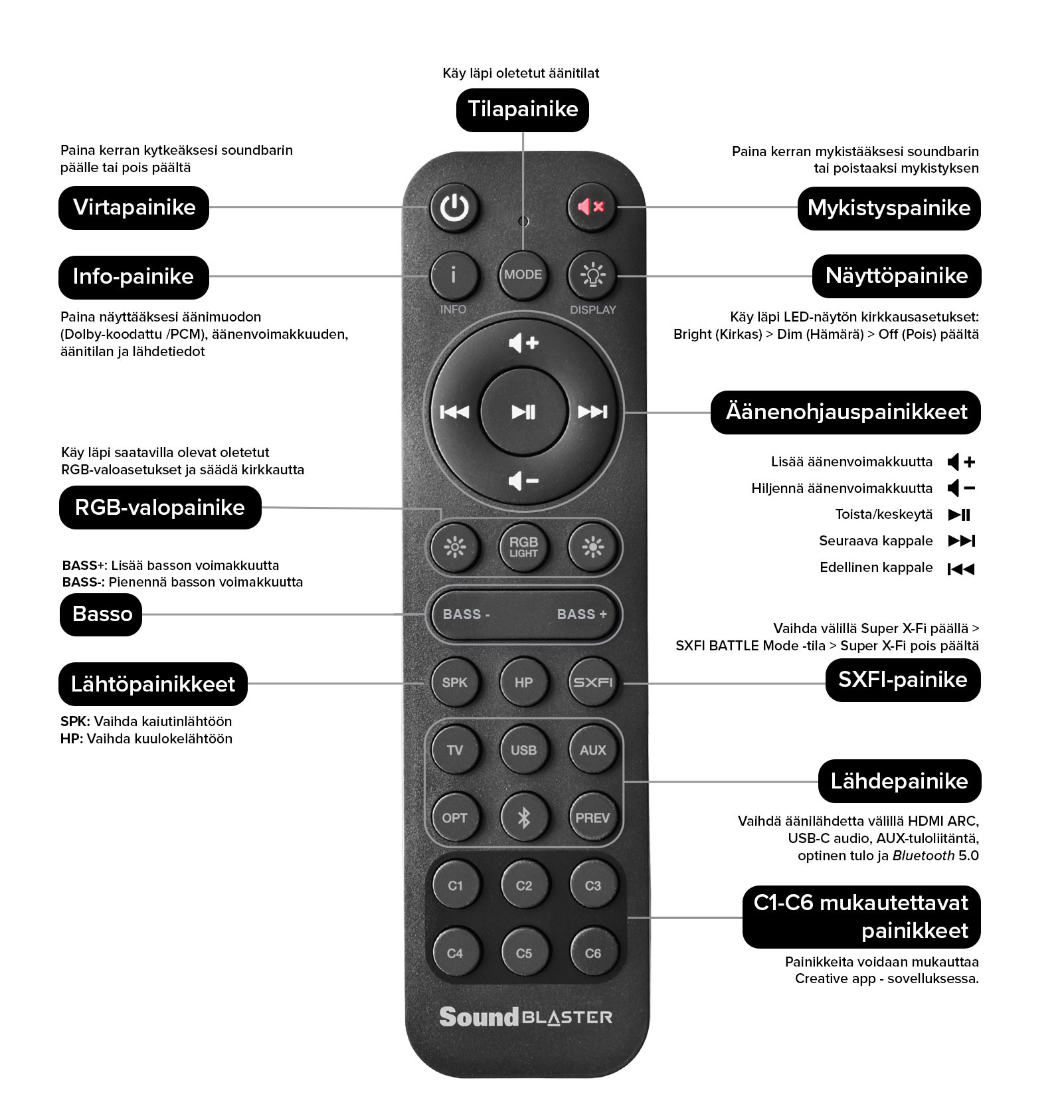 Sound Blaster Katana SE on myös erittäin monipuolinen - siinä on joukko portteja ja liitäntävaihtoehtoja, kuten USB-ääni, HDMI ARC, Bluetooth® 5.0 langattomaan äänen suoratoistoon, optinen sisääntulo, SXFI-lähtö, kuulokeliitäntä ja 3,5 mm:n AUX-tuloliitäntä analogista ääntä varten. Soundbar on myös seinään kiinnitettävä, joten voit asentaa sen myös television alle.